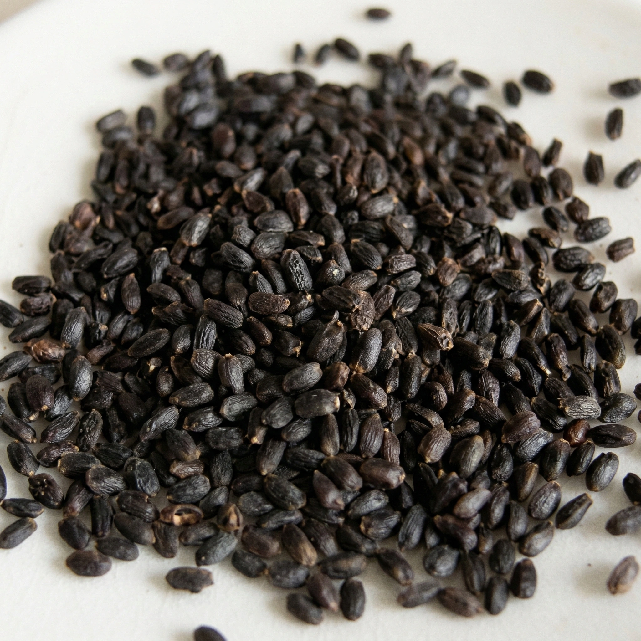 Small, black seeds from sweet basil (Ocimum basilicum), known for their remarkable ability to swell and form a gelatinous coating when soaked in water